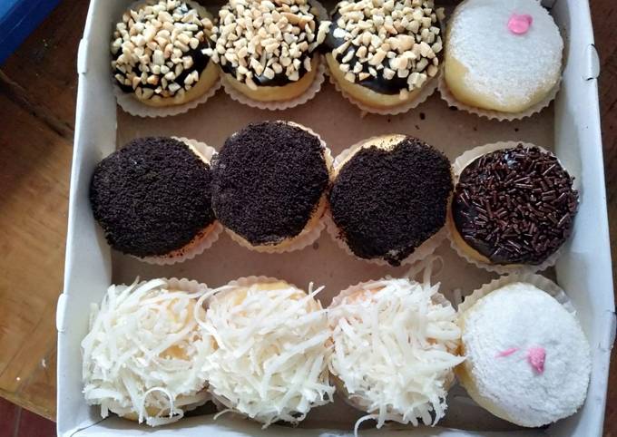 Dengan takaran resep ini aku dapat 30 donat besar dan montok. Untuk pelengkapnya beri glaze meses cokelat keju parut kacang cincang atau gula pasir bubuk. Lihat juga resep Donat Ketan Coklat Keju Lumer enak lainnya.